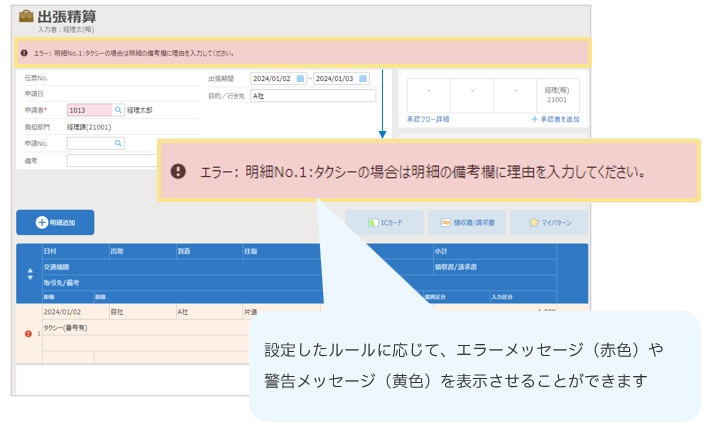 以下の例のように、新たな申請種別に対して、ルールに応じた警告やエラーを出したい場合は、