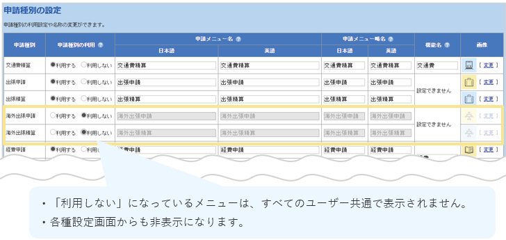 申請メニューの名前や設定画面で表示される機能名、アイコンも変更することができます。