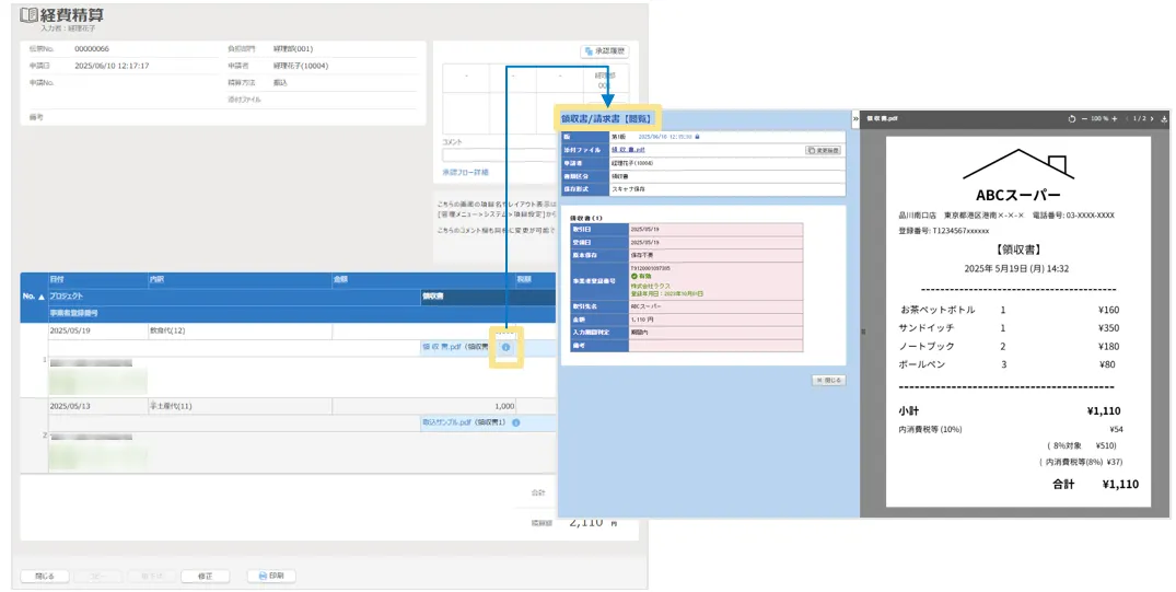 なお、領収書/請求書の新規登録時や確認時にアップロードしたPDFファイルを同一画面内で