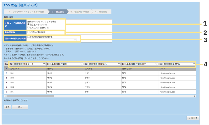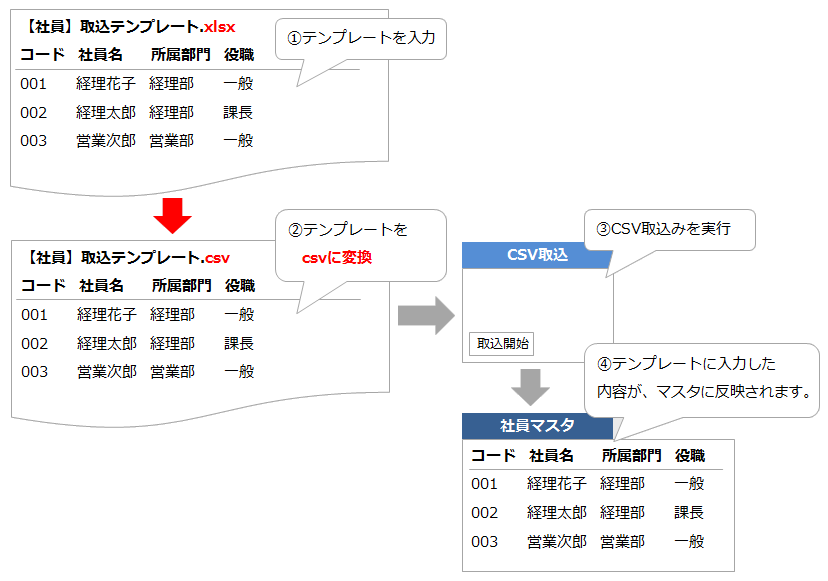 「社員マスタ」を例にCSV取込手順をご案内します。