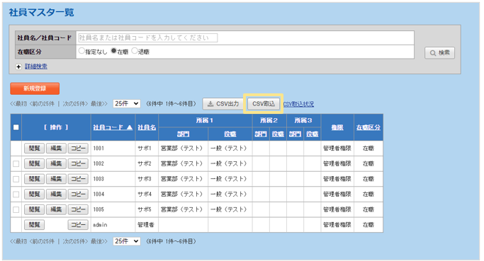 1. 「管理」タブ >「社員マスタ」>「CSV取込」をクリック