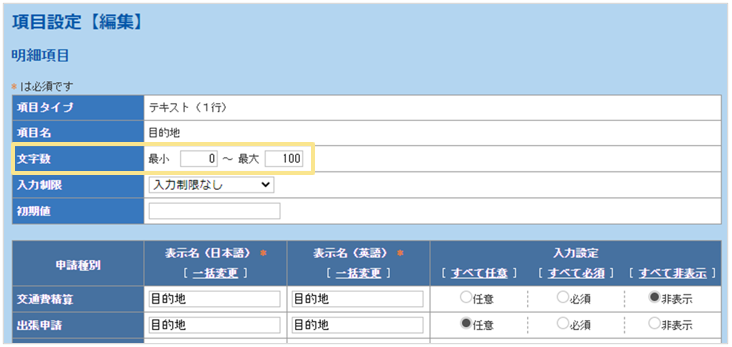 文字数もマスタの仕様に依存するため、「項目設定」で文字数の上限を設定することは
