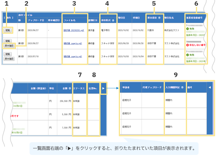 ご利用ください。 - 「書類区分」「取引日」「受領日」「原本保存」「金額」「取引先」は「閲覧」より確認でき、
