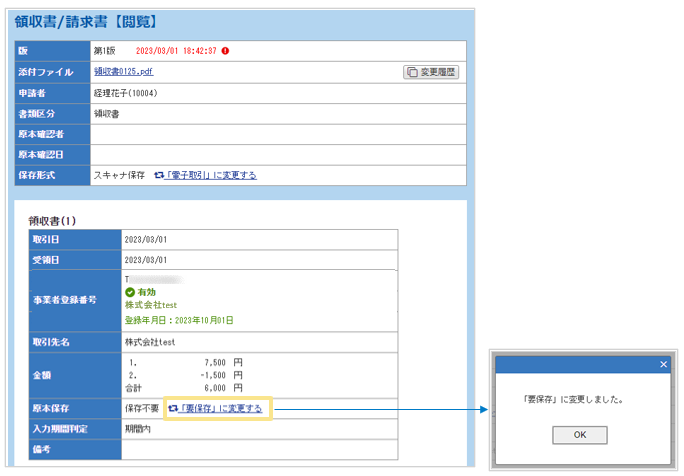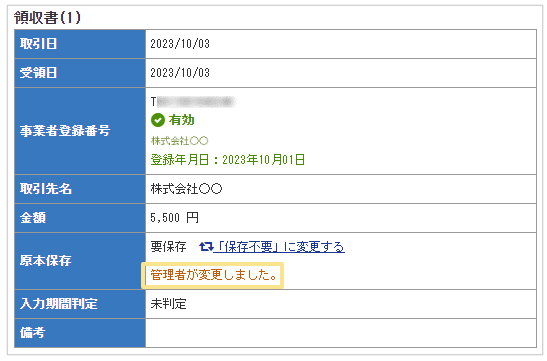 領収書/請求書の原本保存要否(要保存/保存不要)を表示します。