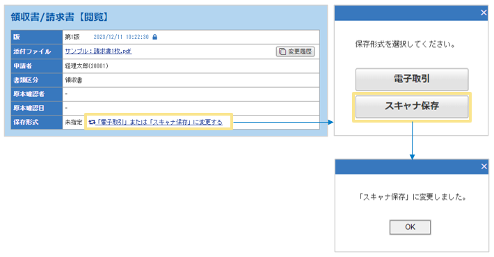 「電子取引」か「スキャナ保存」に変更できます。指定したい保存形式をクリックすると指定が完了します。