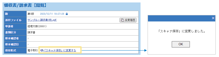 「スキャナ保存」の場合は「電子取引」に、「電子取引」の場合 は「スキャナ保存」に変更できます。