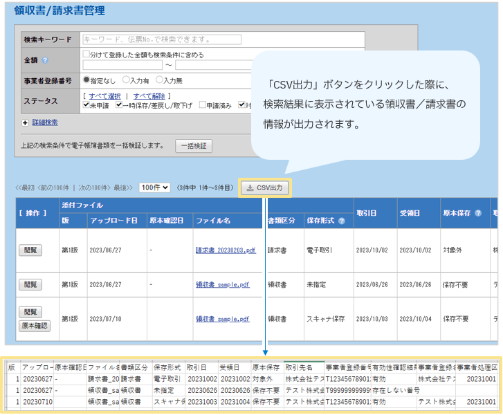 一覧に表示されている領収書/請求書の情報をCSVとして出力することができます。