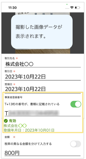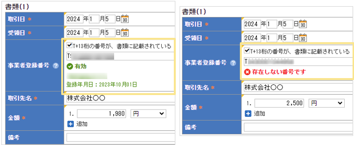 領収書/請求書に登録されている事業者登録番号を確認できます。