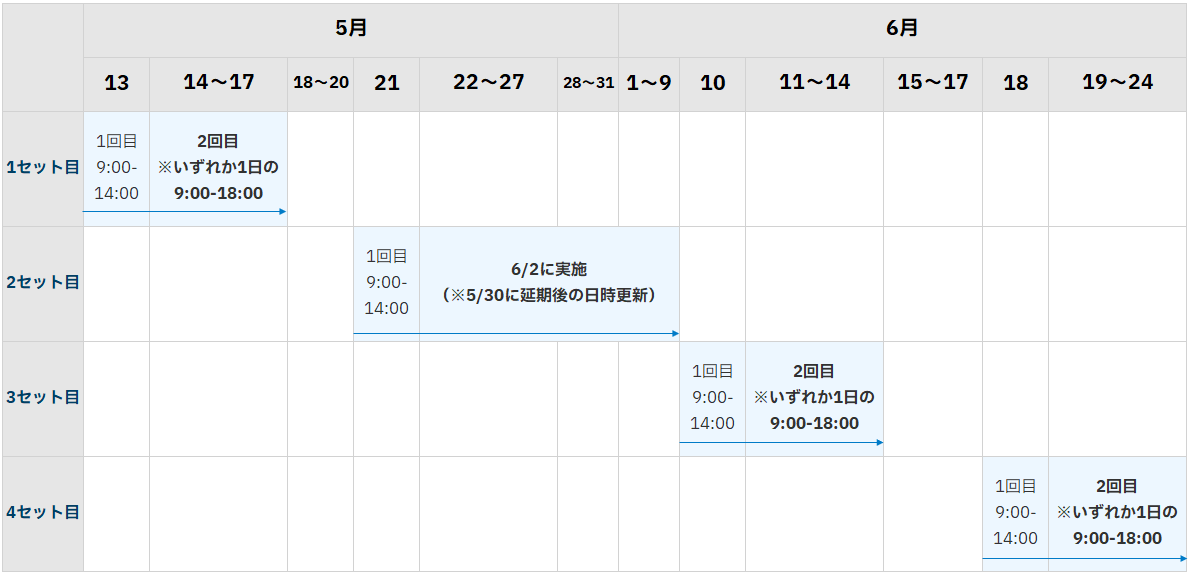 2024年5月13日(月)~6月24日(月)に、4セット(各セット2回ずつ)計8回実施します。