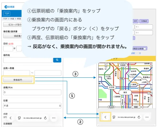 ※乗換案内の画面内で経路を決定後、自動で伝票明細に戻る場合や左スワイプで戻った場合は