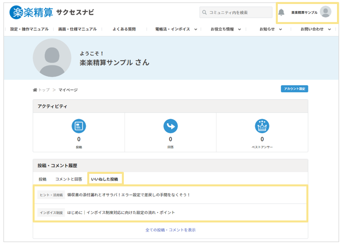 アカウント登録時にご設定いただいた「表示名」は、「楽楽精算サクセスナビ」内各記事