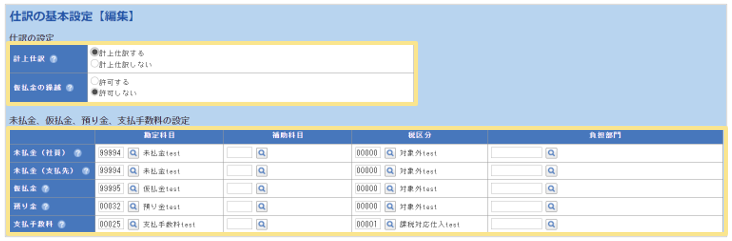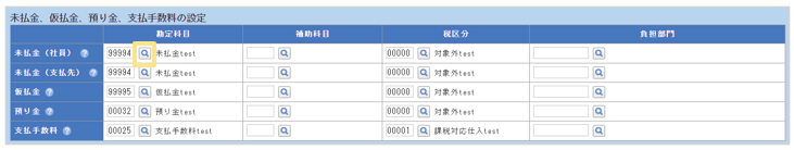 また、未払金や仮払金などの仕訳の勘定科目/補助科目/税区分/負担部門を設定します。