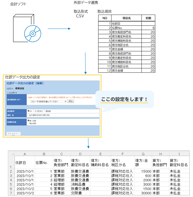 このあと、実際に仕訳データを出力していただき、希望通り情報が正しく出力されているかを