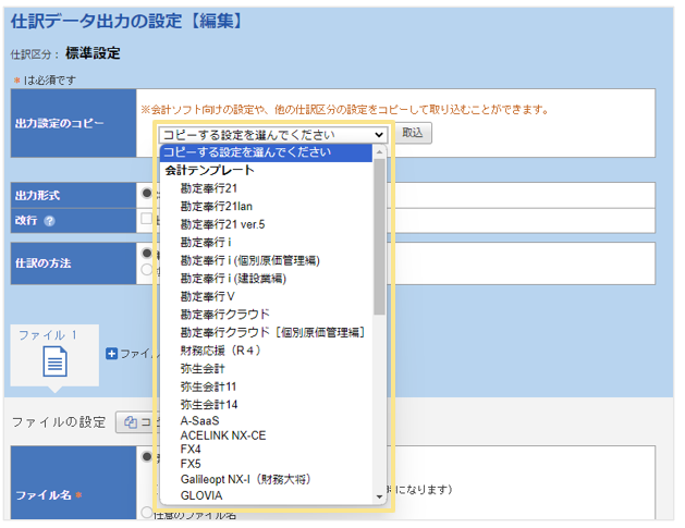 3.「出力設定のコピー」のプルダウンにて、ご利用の会計ソフトのテンプレートがあるかを確認