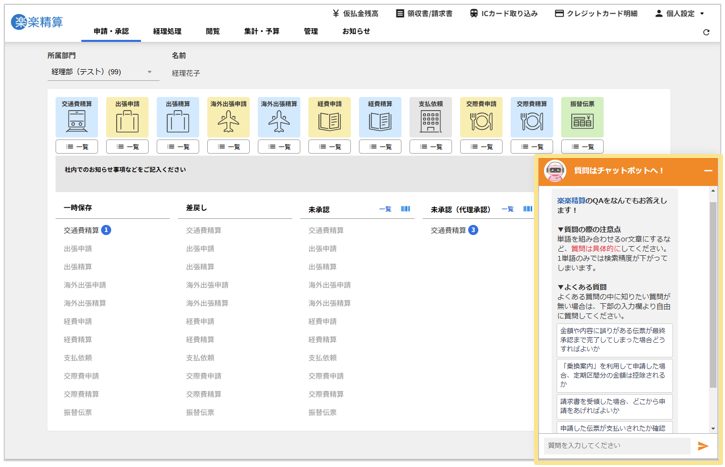 - チャットボットは、「楽楽精算」ログイン後のすべてのタブに表示されます。