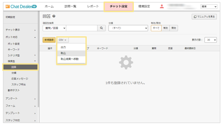 質問や回答を登録する際には、あらかじめ必要な質問と回答を用意しておき、その後CSVで