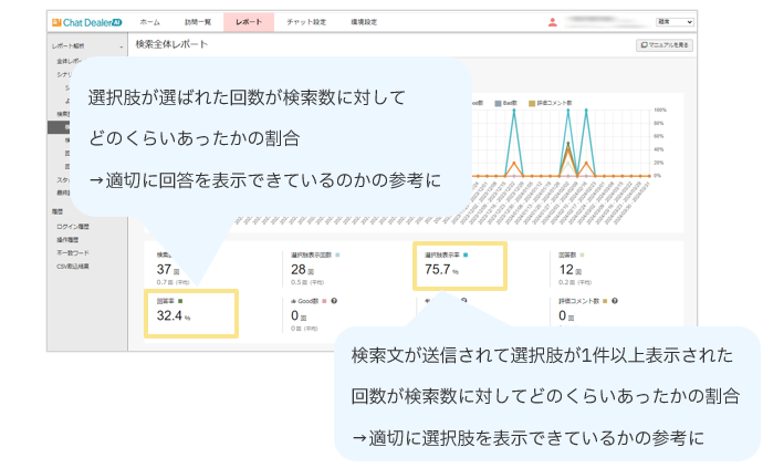 レポート機能にて、チャットボットの利用数や、チャットでの検索に対して適切な選択肢や回答を