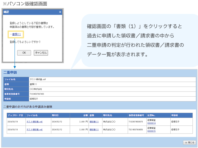 過去に申請した領収書/請求書と内容が重複している恐れがある場合、