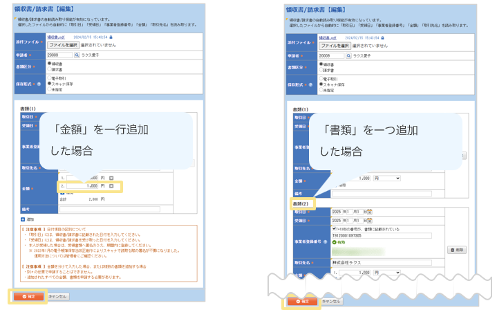 5.領収書/請求書の「金額」または「書類」を追加後、「確定」ボタンをクリック