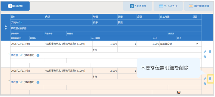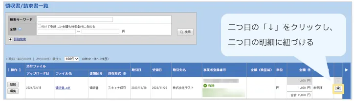 2つ目の伝票明細の領収書/請求書の紐づけをし直さなかった場合