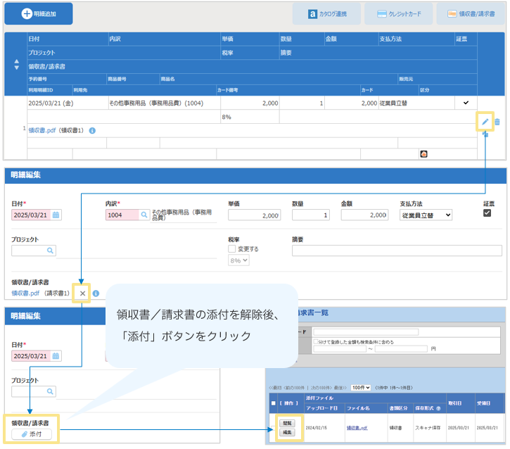 ※差し替えと併せて、アップロードした領収書/請求書の編集も可能です。