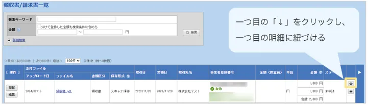 7.修正した領収書/請求書の「↓」ボタンをクリック