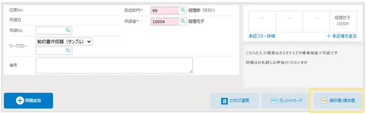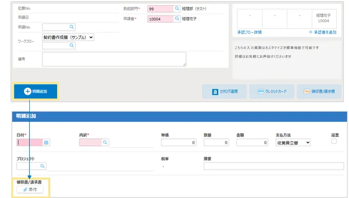 ③申請画面の明細編集および明細追加画面内の領収書/請求書の「添付」ボタンをクリック