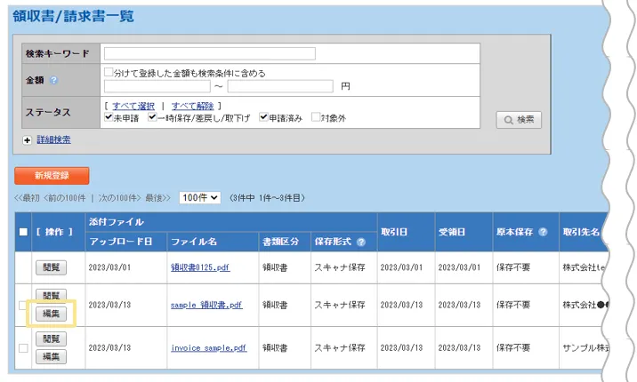 2.「領収書/請求書」の一覧画面にて修正・更新したい領収書/請求書の「編集」をクリック