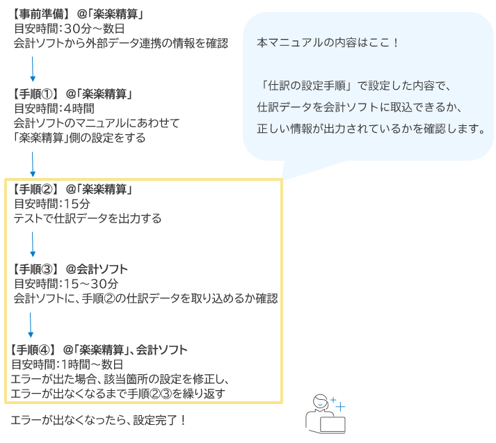 設定した仕訳データを「楽楽精算」から出力し、実際に会計ソフトへ取り込めるか確認しましょう。
