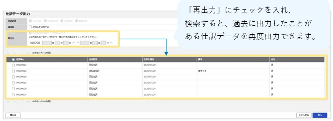 - 設定変更後、過去に出力した仕訳データを再度出力したい場合は、手順2.で「再出力」に