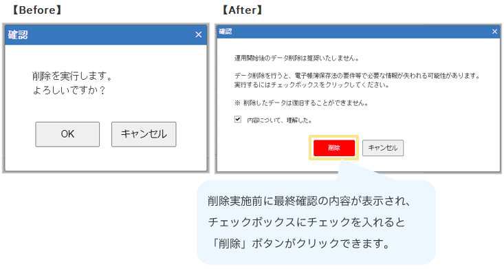 本仕様変更にて、電子帳簿保存法などの観点で必要な情報を削除してしまわないように、確認内容を