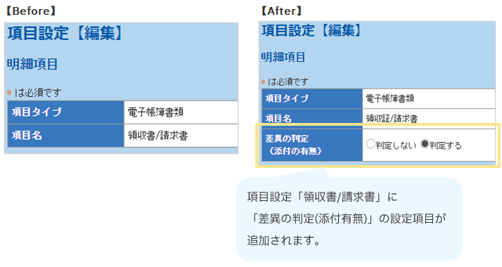 バージョンアップ後、「領収書/請求書」項目の添付有無による差異判定をしない場合は、