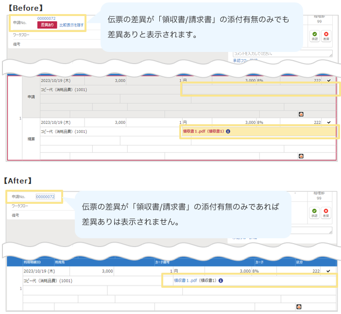 これにより、差異が「領収書/請求書」項目の添付有無のみのとき、「領収書/請求書」項目の差異は