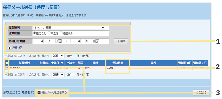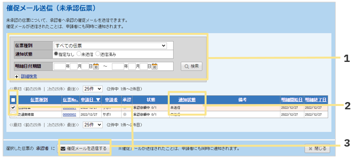 「申請・承認」タブ >「催促メール送信」から伝票の状態毎に確認、送信が可能です。