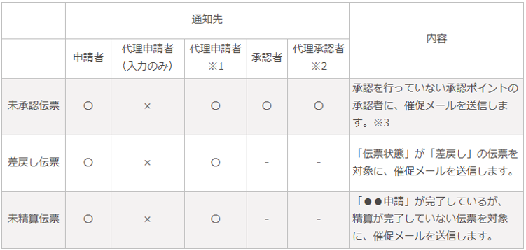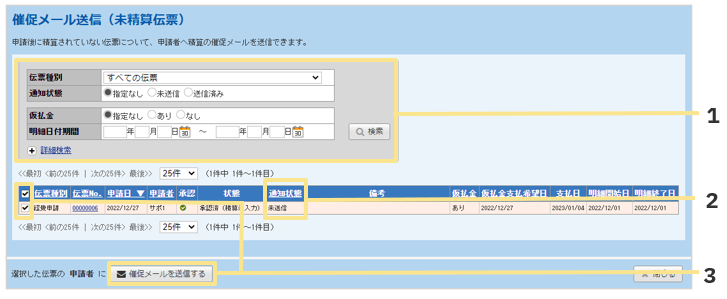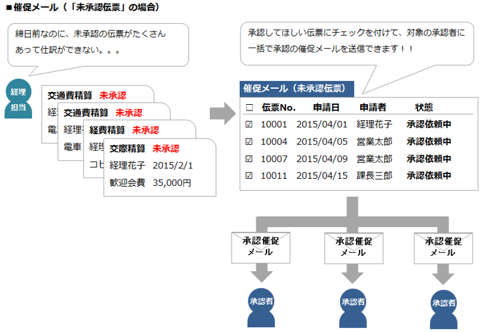 いれば誰でも送信が可能です。 - 未精算や未承認の伝票がある場合に、申請者や承認者に精算や承認を促すメールを送信できます。