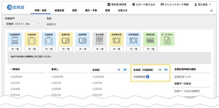 - 「未承認(代理承認)」欄は、代理承認対象の伝票のみ表示されます。