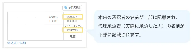 - 代理承認者が承認した場合、本来の承認者の名前が上部に記載され、