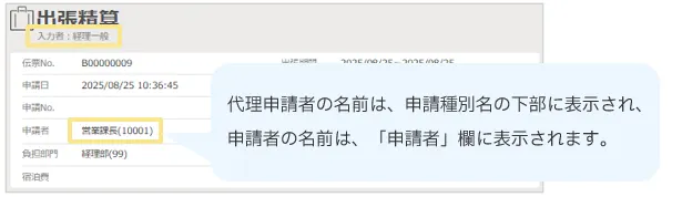 詳細は、代理で伝票を申請した場合に、申請者名はどのように表示されるか知りたいを