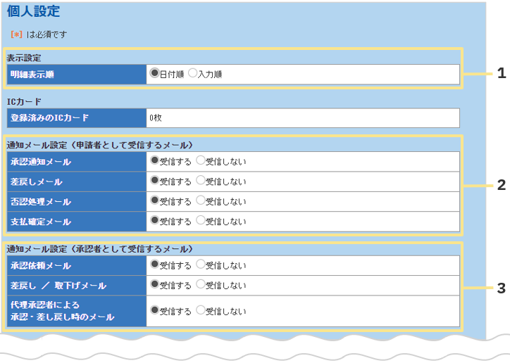 ・通知メール、代理申請者(入力のみ)、代理承認者の設定などを行うことができます。