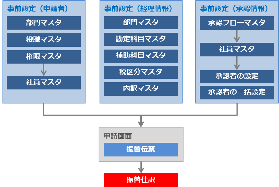 - 振替伝票にて申請した伝票の仕訳を行います。