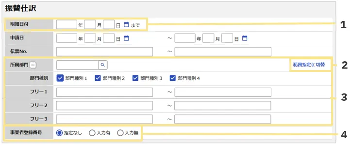 ・入力無 :事業者登録番号が入力されている明細が1件もない伝票を検索します。