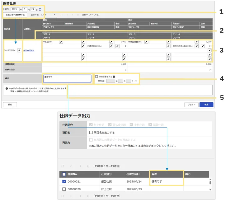 「仕訳データ出力」の一覧画面の「備考」欄に表示されます。