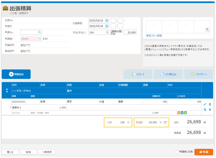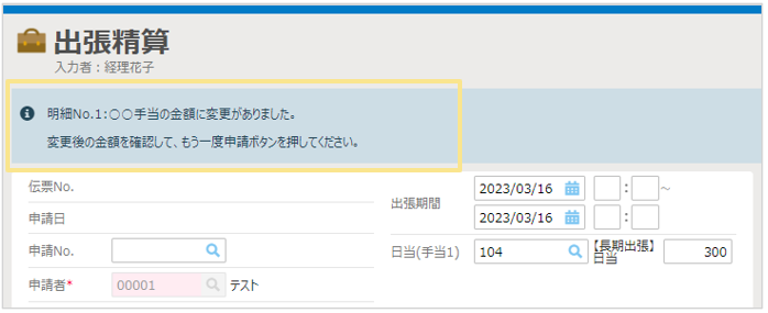 「再計算ボタン」をクリックせずに「申請」ボタンを押した場合は、自動で手当が再計算されます。
