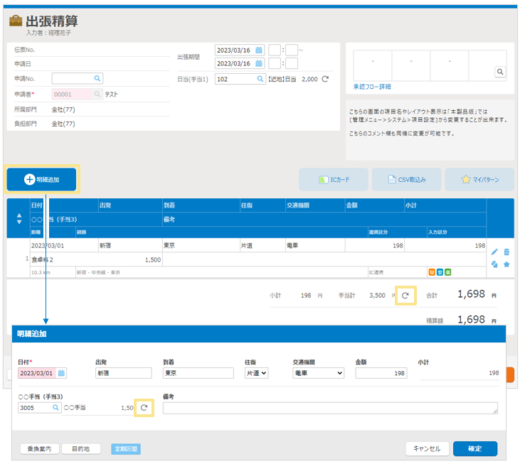 クリックするとその明細に配置された「手当」項目の金額が再計算されます