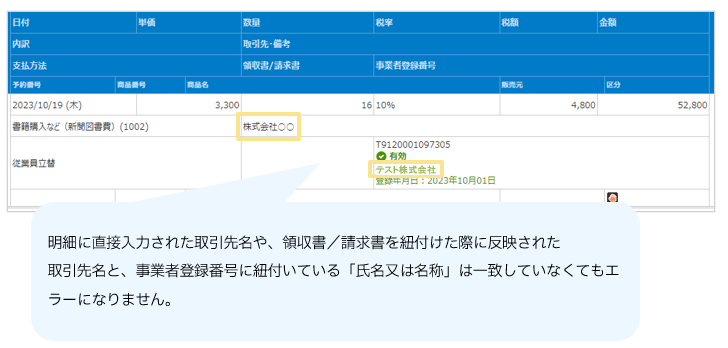 インボイス 事業者登録番号の有効性判定で表示される「氏名又は名称」と明細に入力されている「取引先名」があればその名称が一致しているかも判定されるか知りたい