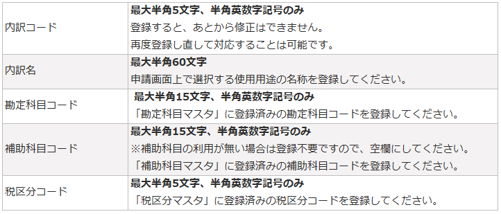 そのため、上記の申請種別を利用しない場合は「内訳マスタ」の登録は不要です。