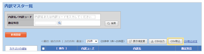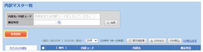 2. 「内訳マスタ」画面左上の「新規登録」をクリック