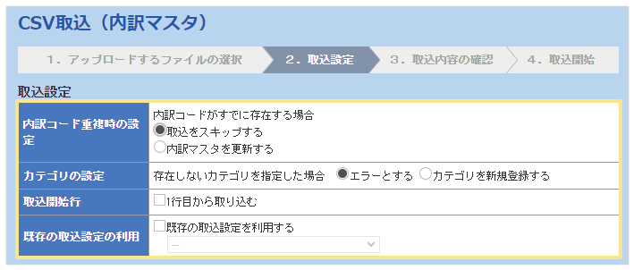 一番上の「ID重複時の設定」を「内訳マスタを更新する」にしてください。
