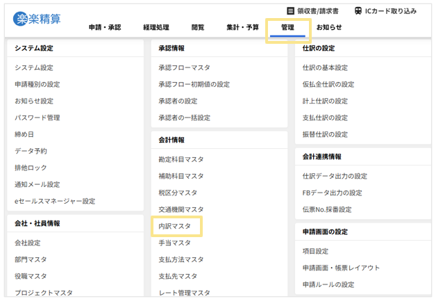 6. 「楽楽精算」にログインして「管理タブ」をクリックし、「会計情報」の「内訳マスタ」を