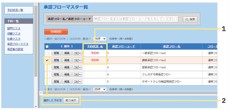 - 左の「予約一覧」メニューの各マスタや「承認者の設定」より、データを更新したい項目を選択